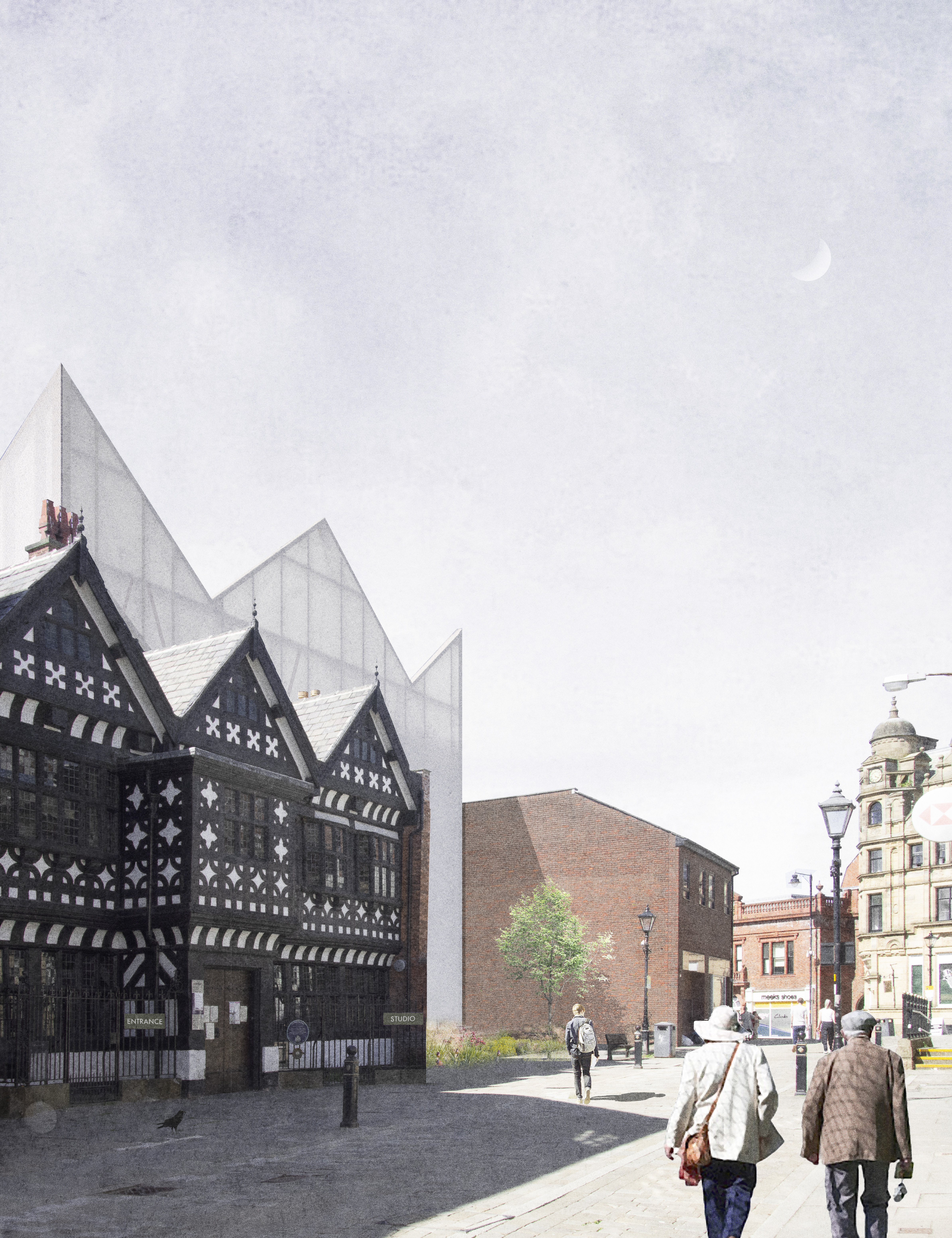 As a direct response to conversations as to how architecture can respond to the ‘dying’ highstreets in Northern towns. The position of the unused department store within the Brutalist Merseyway development offers an opportunity to re-imagine the life of the highstreet. The deep floor plates of the former Next department store, situated within the Merseyway is punctured to form an intimate school courtyard providing area for play, views for all classrooms and daylight. The once oppressive concrete structure forms a perimeter wall around the school, providing both a sense of safety and permeable high street presence.